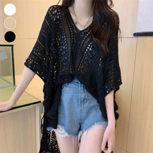 (스타일하우스) 니트티 스웨터 티셔츠 여행 바캉스 동 남아 여성스런 비치커버업 긴팔 펀칭 니트티