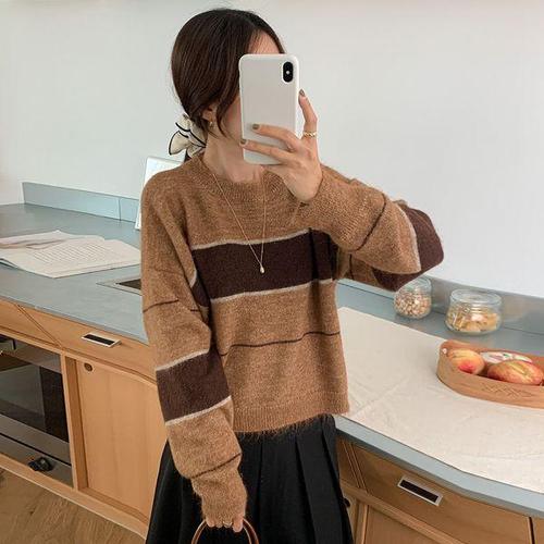 [유야]단가라 배색 울 니트 긴팔티 -NT0164H- 빅사이즈 루즈핏 여성 가을 겨울