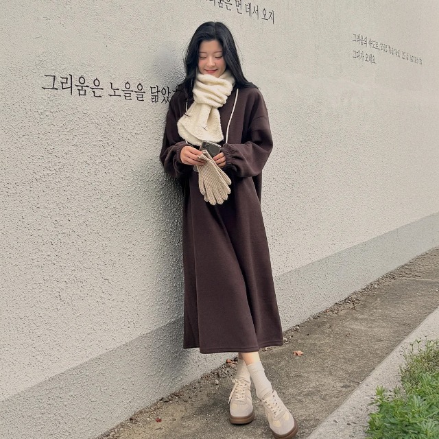 POMTOR 빅사이즈 루즈핏 편한 겨울 원피스 긴팔 미디원피스 포켓 부드러운 원피스