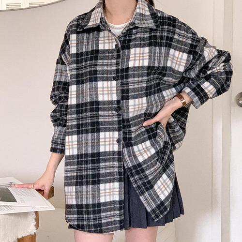 [옷자락]여자 빅사이즈 체크 셔켓 언발 루즈 박시핏 겨울 셔츠