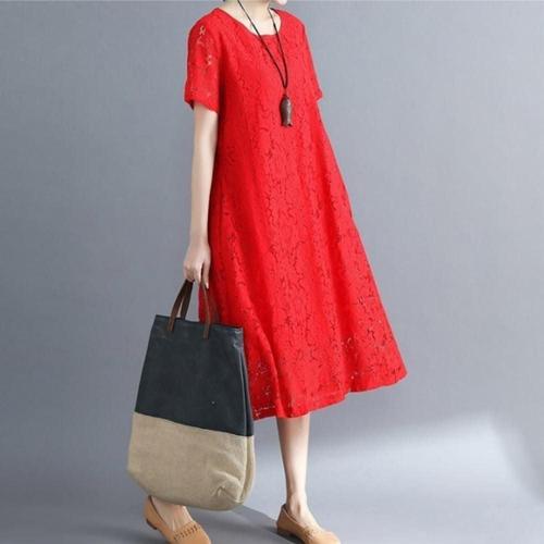 여성 빅사이즈 여름 반팔 쉬폰 원피스 레이스 드레스 WFNNM0D