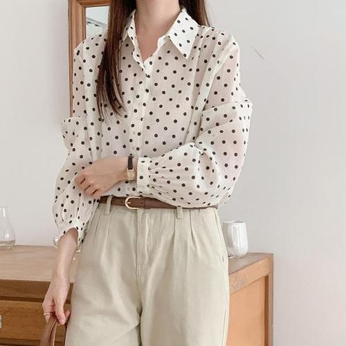 [다잇템][다잇템] 여자 땡땡이 가을하객 빅사이즈 비침 카라넥 링클 셔츠_22388217_588872