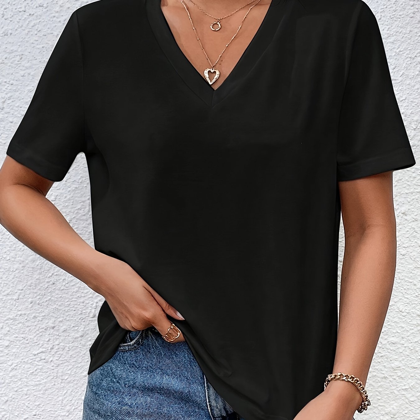 TEMU 여성용 캐주얼 V넥 반팔 티셔츠 - 부드럽고 통기성 좋은 소재, 세탁기 사용 가능, 사계절 착용감 편안한 레귤러 핏 H라인, 단색 다용도 상의, 클래식 V넥 스타일, 매끈한 질감, 루즈핏, 내구성 있는 베이직 티, 디자인