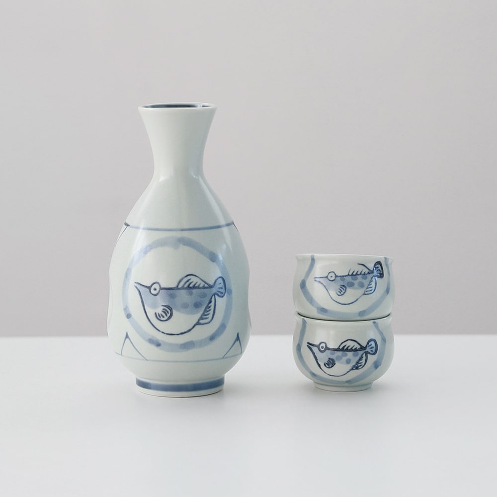 귀여운 복어 일본 도쿠리 사케 술병과 술잔 이자카야