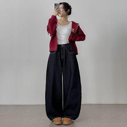 [옷자락]여성 와이드 데님 팬츠 키치 무드 코튼 생지 진청 논페이드