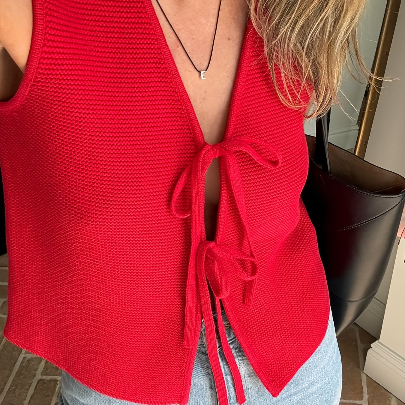 TEMU 레드 레이스업 베스트, 우아한 스타일의 패셔너블 보우 프론트 가디건, 여성용 봄&여름 의류
