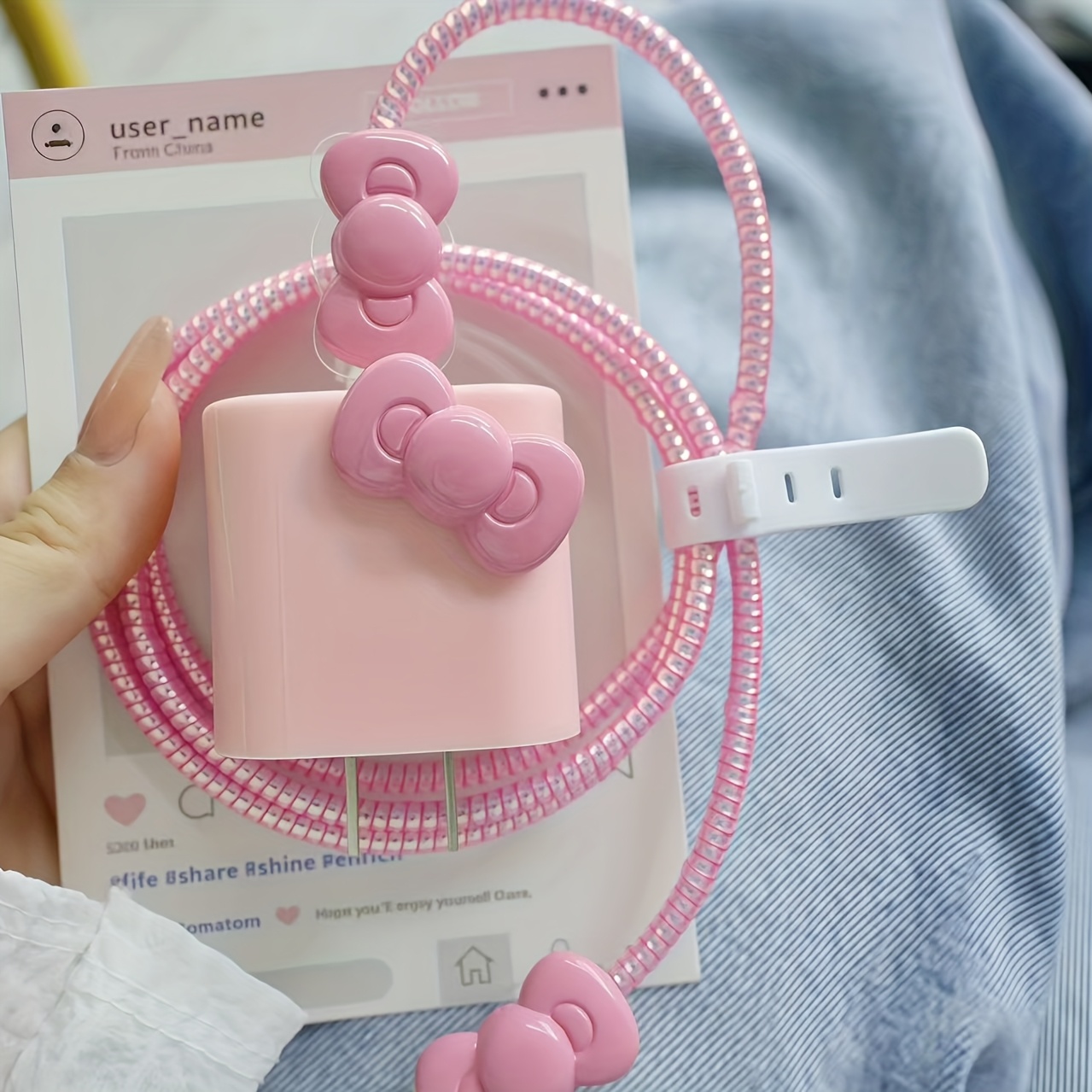 TEMU 귀여운 핑크색 리본형 충전기 및 코드 보호대 - iPhone 15/14, 18W / 20W 충전기용 TPU 내구성 있는 안티- 벤트, 사랑스러운 장식품, 가제트 보호, 휴대폰 액세서리, 플레이풀한 디자인, 유연한 커버, 튼튼한 구조, 충전 커버, 선물 사려분들을 위한