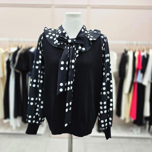[샤틴]니트배색 도트 리본타이 블라우스S253K266A