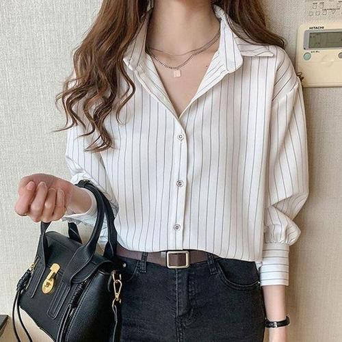 빛깃닥 여성 흑백 세로 줄무늬 쉬폰 셔츠 칼라넥 벨슬리브 오피스 캐주얼 상의