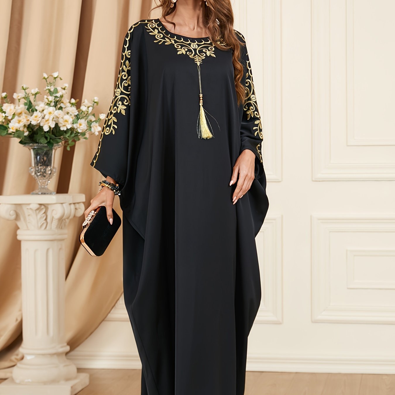 TEMU 플러스 사이즈 - 중동 캐주얼 자수 라운드넥 배트윙 텐트 긴팔 드레스