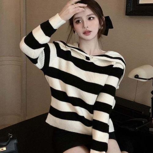 [셀럽하우스]스트라이프 PCLG8790 배색 패턴 여자 세일러 카라넥 니트