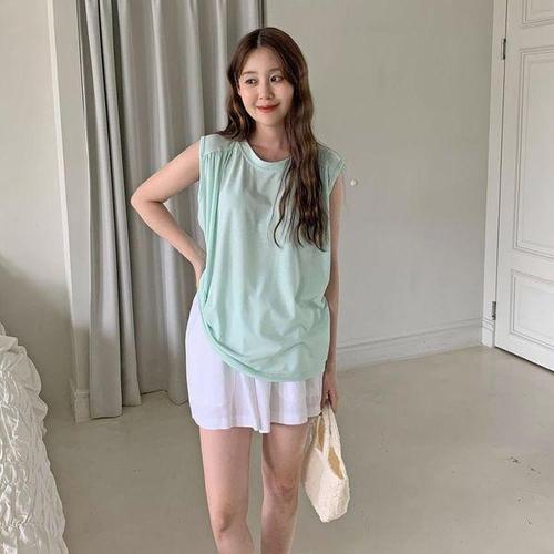 [옷자락] 여자 레이온 스판 라운드넥 핀턱 셔링 민소매 티셔츠