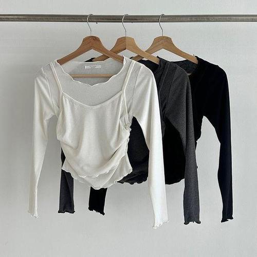 [신상오픈런]여성 여리핏 홀터넥 나시 레이어드 셔링 트임 긴팔 티셔츠