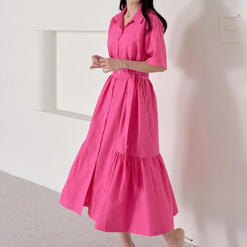 [바이어스]벨트 셔링 카라 싱글 A라인 반팔 롱 셔츠 원피스 코디 (15240514)