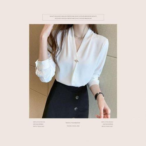 여성용 화이트 쉬폰 블라우스 기본 브로치 셔츠 WFLHYR3