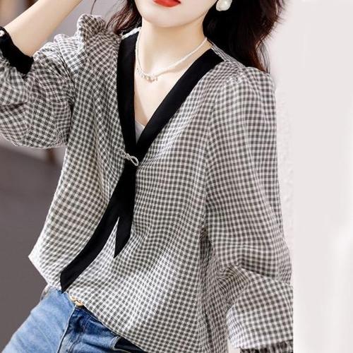 [엄지척]고급 큐빅 브로치 블라우스 여성 브이넥 체크 티 셔츠_19651518_667501