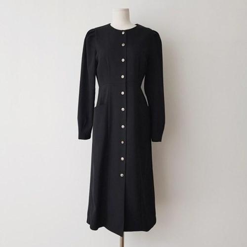 [신상오픈런]여성 정장룩 퍼프소매 노카라 단추 절개 롱 원피스