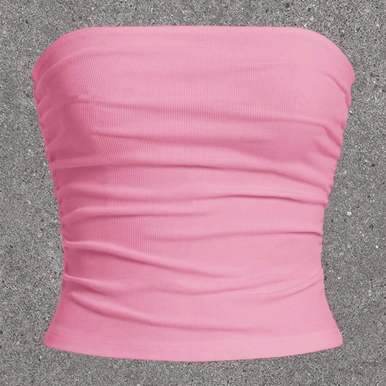 TEMU 생동감 있는 핑크 여성용 주름 튜브 탑 - 민소매, 신축성 있는 폴리에스테르 & 엘라스테인 혼방, 세탁기 사용 가능 - 시크하고 편안한 여름 의류