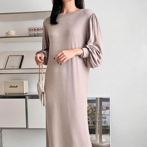 |KSO594E|여성 롱원피스 심플 소프트 스판 어깨 셔링 데일리 무지 드레스