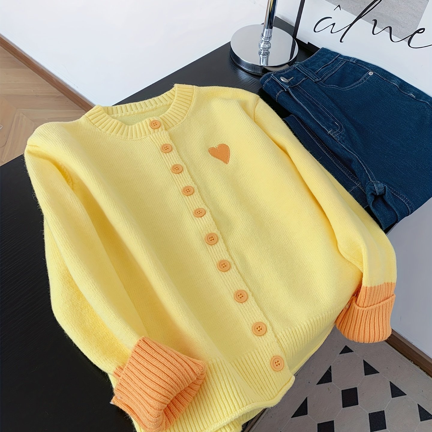 TEMU 프렌치 스타일 우아한 옐로우와 오렌지 대비 컬러 핏컷 하트 라운드넥 패브릭 가디건, 봄과 가을 캐주얼 스트리트 출근룩에 적합