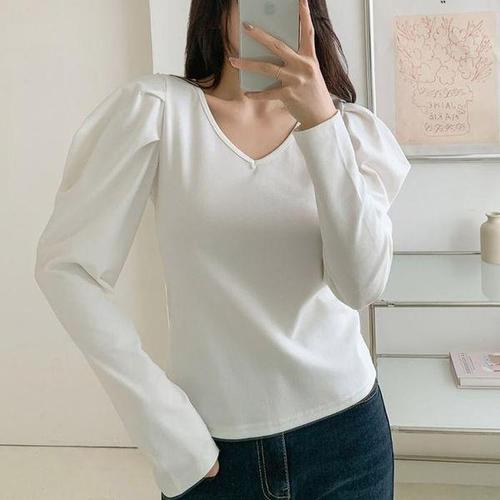 더시럽 여성용 숄더 포인트 골지 슬림 긴팔티