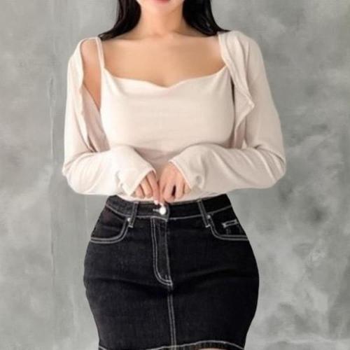 [다잇템]여성 슬림핏 슬리브리스 단가라 숏가디건 세트