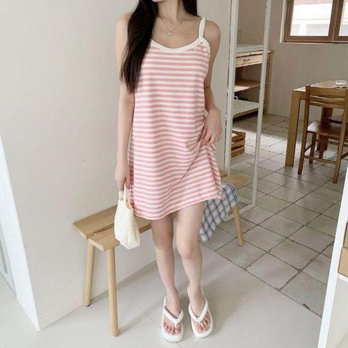 [신상오픈런]여성 스트라이프 면혼합 타올 나시 미니 드레스