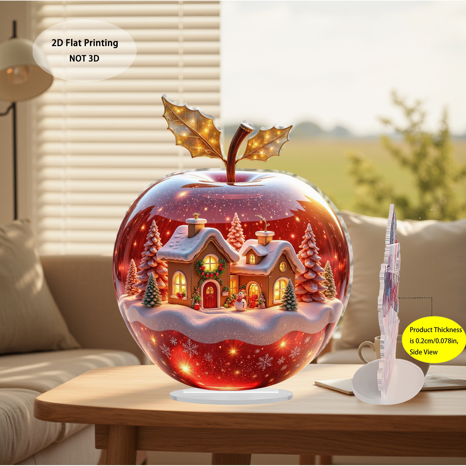 TEMU 2D 플랫, 2D 플랫 크리스마스 사과 집 장식 - 눈이 내리는 밤의 장면이 있는 탁상 장식, 가정, 사무실, 파티용 아크릴 장식품 - 전기 불필요, 세척 용이 - 가족, 친구를 위한 완벽한 크리스마스 선물