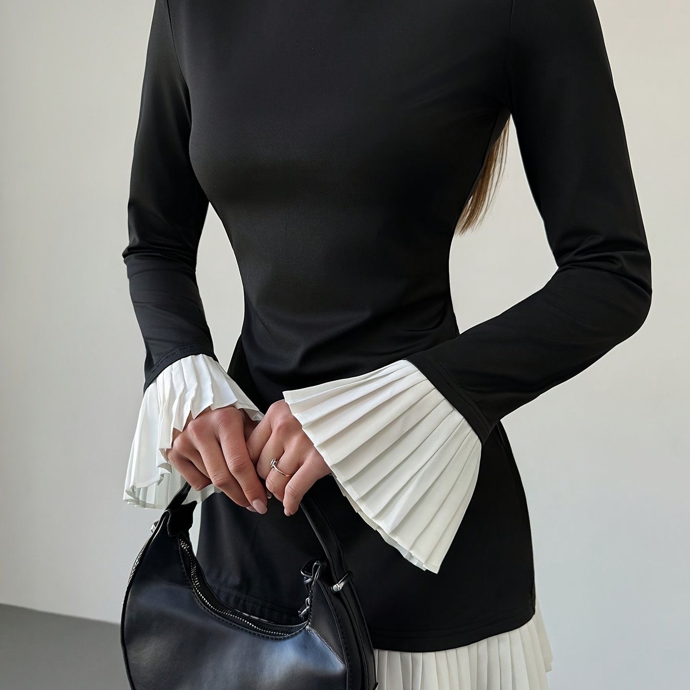 TEMU 여성용 우아한 A라인 드레스 - 롱 러플 소매 & 플리츠 밑단, 스트레치 미니 길이, 라운드넥, 세탁기 사용 가능, 봄/여름 캐주얼~포멀 웨어, 스프링 패션, 시크 스타일, 고품질 소재