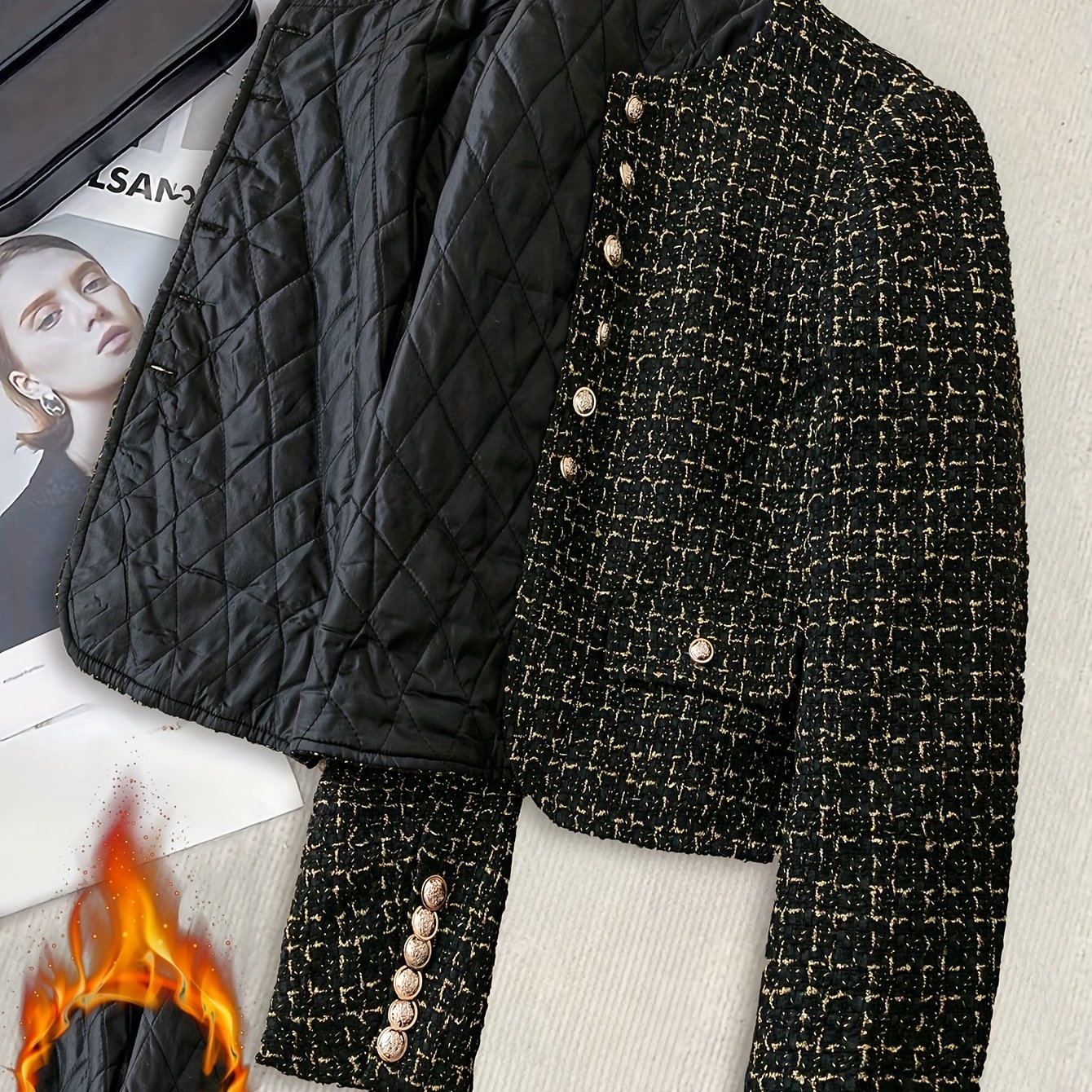 TEMU 여성용 우아한 두꺼운 퀼트 재킷 - 블랙 & 화이트 체크 패턴, 라운드 넥, 버튼 프론트 클로저, 가을 겨울용 아늑한 아우터웨어, 스타일리시하고 따뜻한 겨울 자켓, 텍스처드 원단, 내구성 있는 구조, 캐주얼 웨어