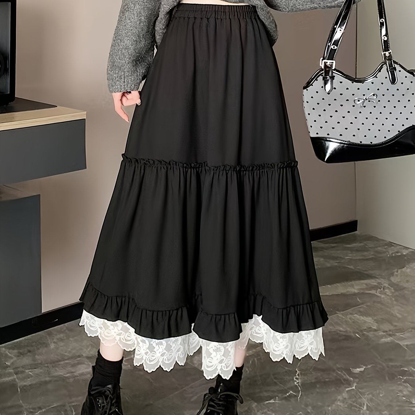 TEMU 레이스 트림 A라인 스커트 - 블랙 & 화이트 대비 컬러 블록, 플레어드 러플 밑단, 매력적인 핏, 봄 여름 가을용 세탁기 사용 가능, 캐주얼부터 포멀까지의 의상, 레이스 스커트, 다재다능한 패션, 피티드 실루엣, 부드러운 원단 상단