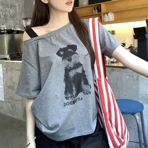 오프숄더 슈나우저 그레이 캐주얼 프린팅 티셔츠