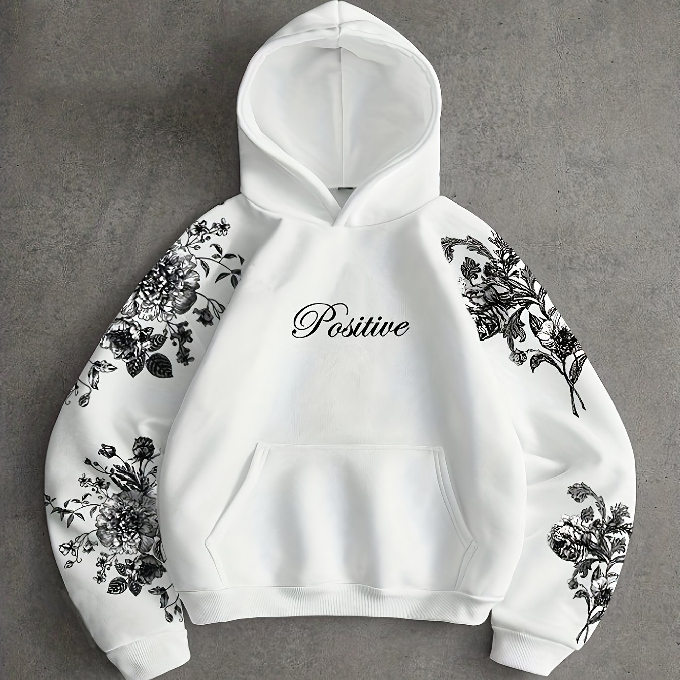 TEMU 남성용 패션 스트리트 플로랄 프린트 후드 스웨트셔츠, 화이트 "포지티브" 레터링 아트 탑