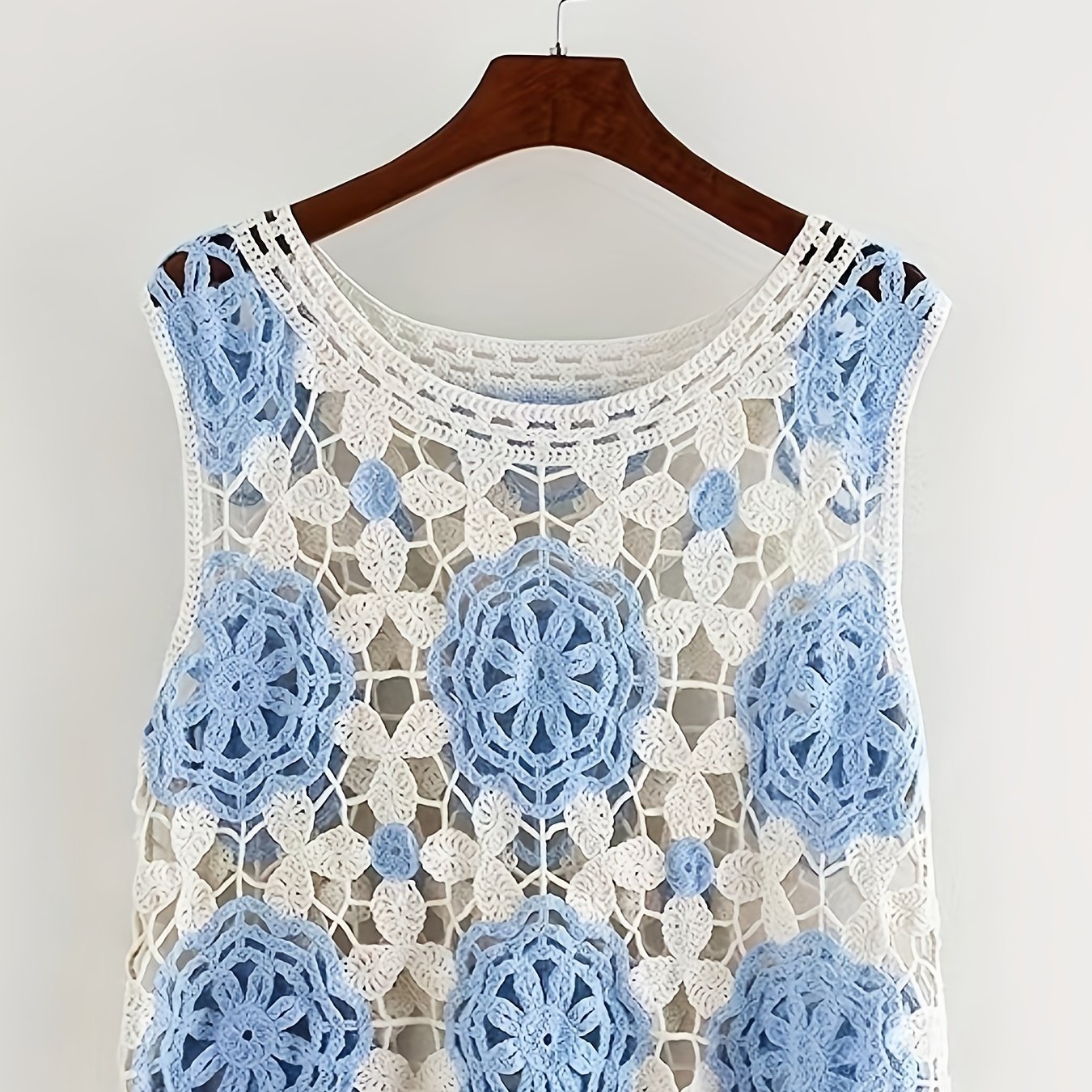 TEMU 1pc 우아한 플로럴 패턴 민소매 鏤空 상의 여성용, 여름 캐주얼 라운드넥 탱크 두꺼운 끈, 폴리에스터 비늘 스트레치 원단, 일반 핏 - 파랑과 흰색