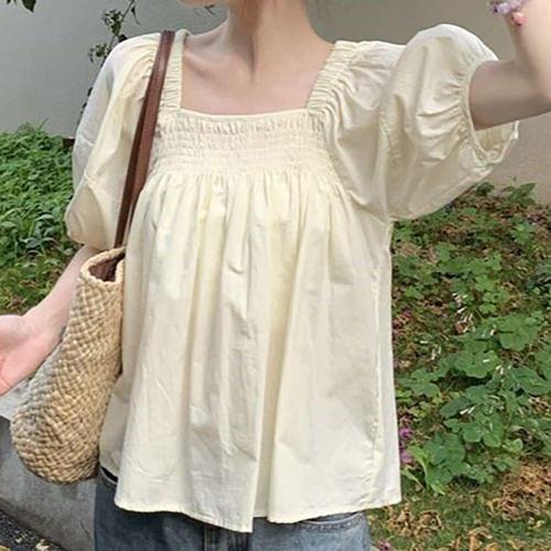 여자 스퀘어넥 스모크 밴딩 플레어 반팔 블라우스
