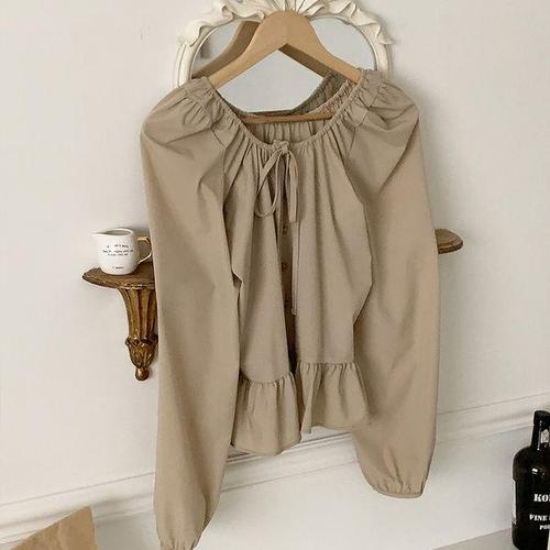 cammello 스모크 디테일 프릴 리본 크롭 블라우스 봄가을 긴팔 하객룩