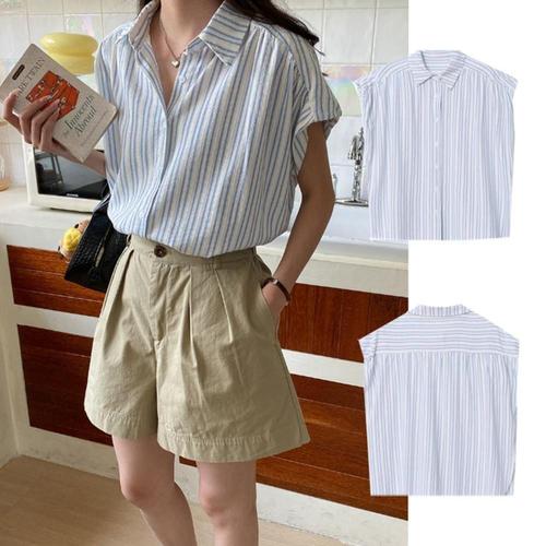 [모노무드]모노무드 여성 여름 가볍고 시원한 스트라이프 여리여리무드 스카이블루 반팔 셔츠 블라우스
