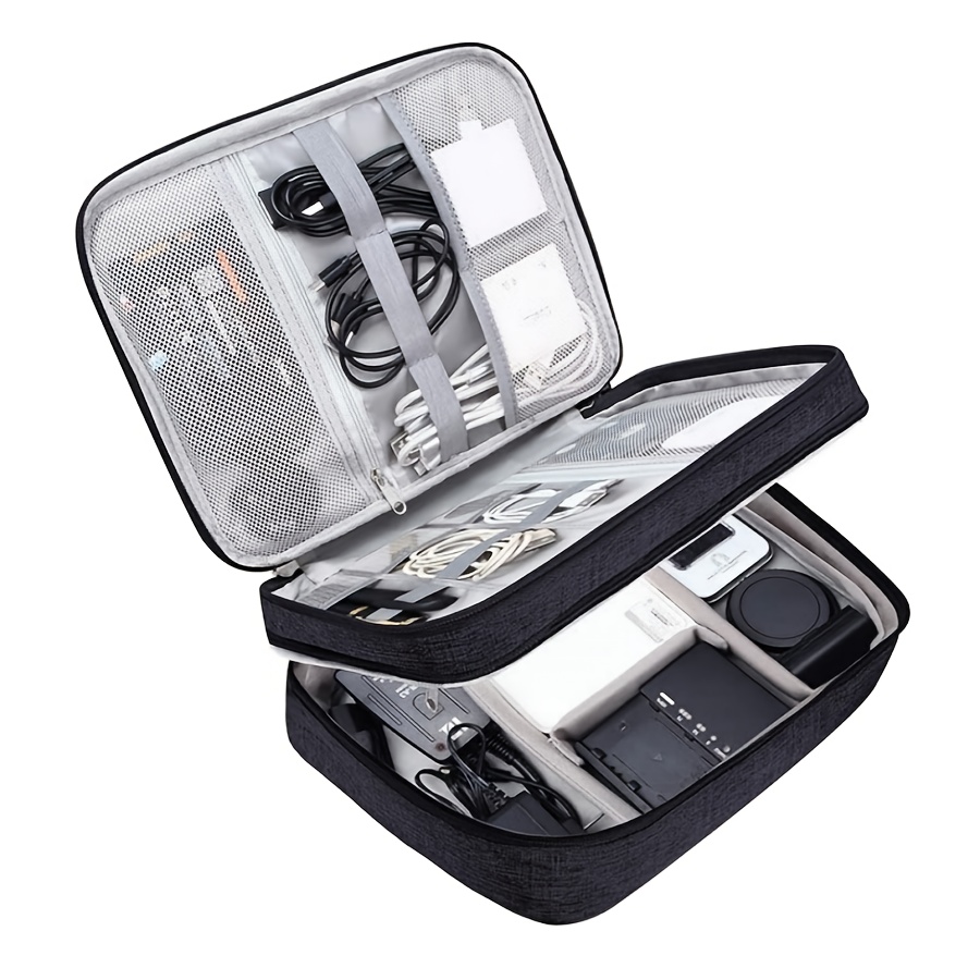 TEMU 2025 블랙 전자 가방 여행용 케이블 액세서리 가방 더블 레이어 전자 정리 휴대용 보관 케이스 (케이블, 코드, 충전기, 휴대폰, 어댑터, 보조배터리, 킨들, 하드 드라이브용)