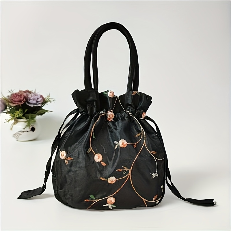 TEMU 우아한 플로럴 자수 여성 클러치, 세련된 드로스트링 버킷백, 폴리에스터 안감, 동전 및 휴대폰 보관에 완벽, 화이트와 핑크 색상, 귀여운 핸드백