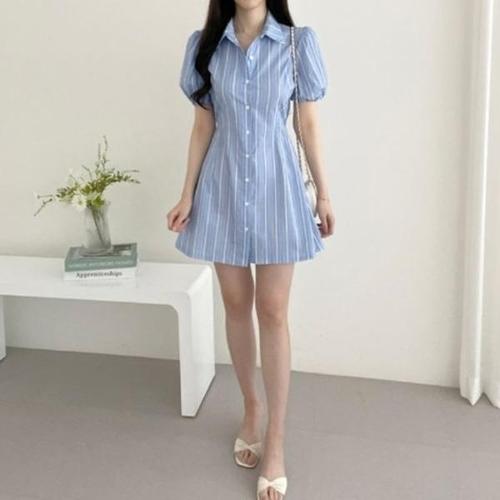 [엄지척]데이트룩 퍼프소매 스트라이프 반팔 셔츠 원피스2컬러_19951751_667501