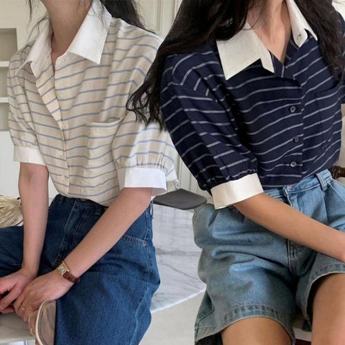 [굿쇼핑몰_의류]여성 스트라이프 반팔 카라 줄무늬 셔츠