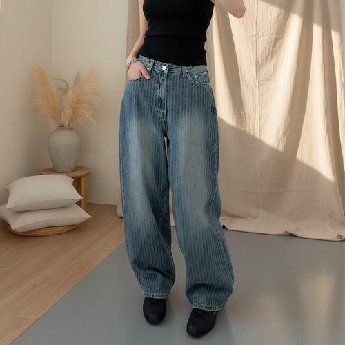 [옷자락] 여자 로우 스트라이프 워싱 와이드진 중청 벌룬 청바지