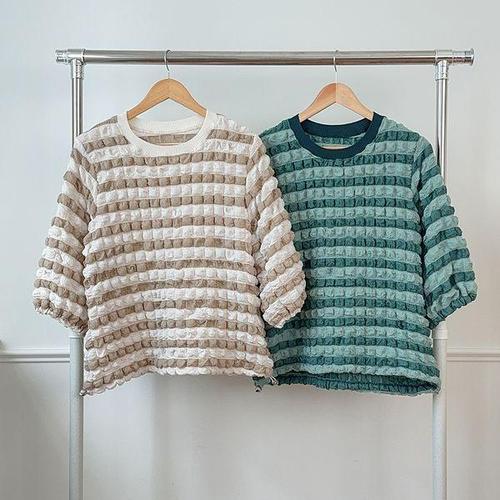 [옷자락]여성 배색 단가라 엠보 칠부 라운드 블라우스