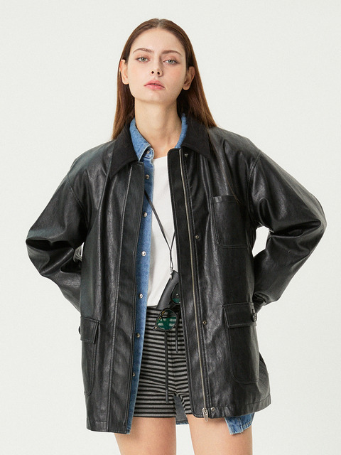 [놈니크] 멀티 포켓 페이크 레더 사파리 자켓_검정