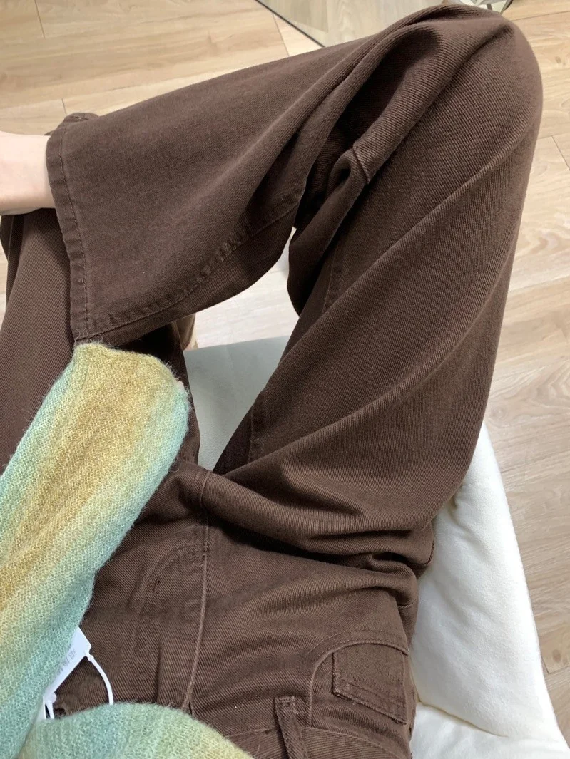 하이웨이스트 와이드 레그 진 여성용 루즈핏 캐주얼 바지 커피색 봄 신상 플러스 사이즈 슬림 롱 팬츠