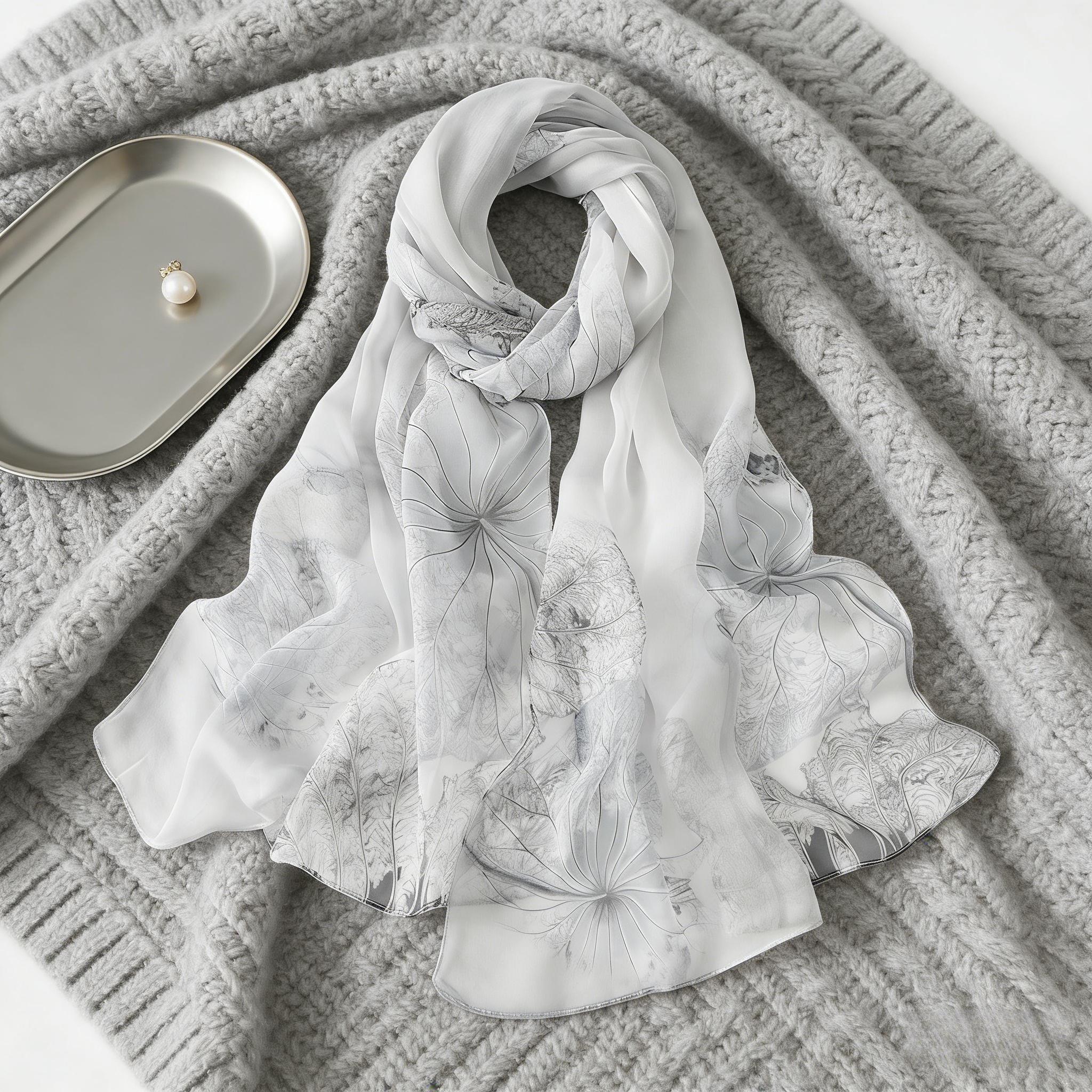 TEMU 1개 여성용 100% 멀베리 실크 스카프, 우아한 잉크 연꽃 잎 프린트 시어 숄, 자연스러운 피부 친화적 & 통기성 좋은 부드러운 랩, 가벼운 사계절 활용 가능한 패션 액세서리 (일상 통근, 여행용)