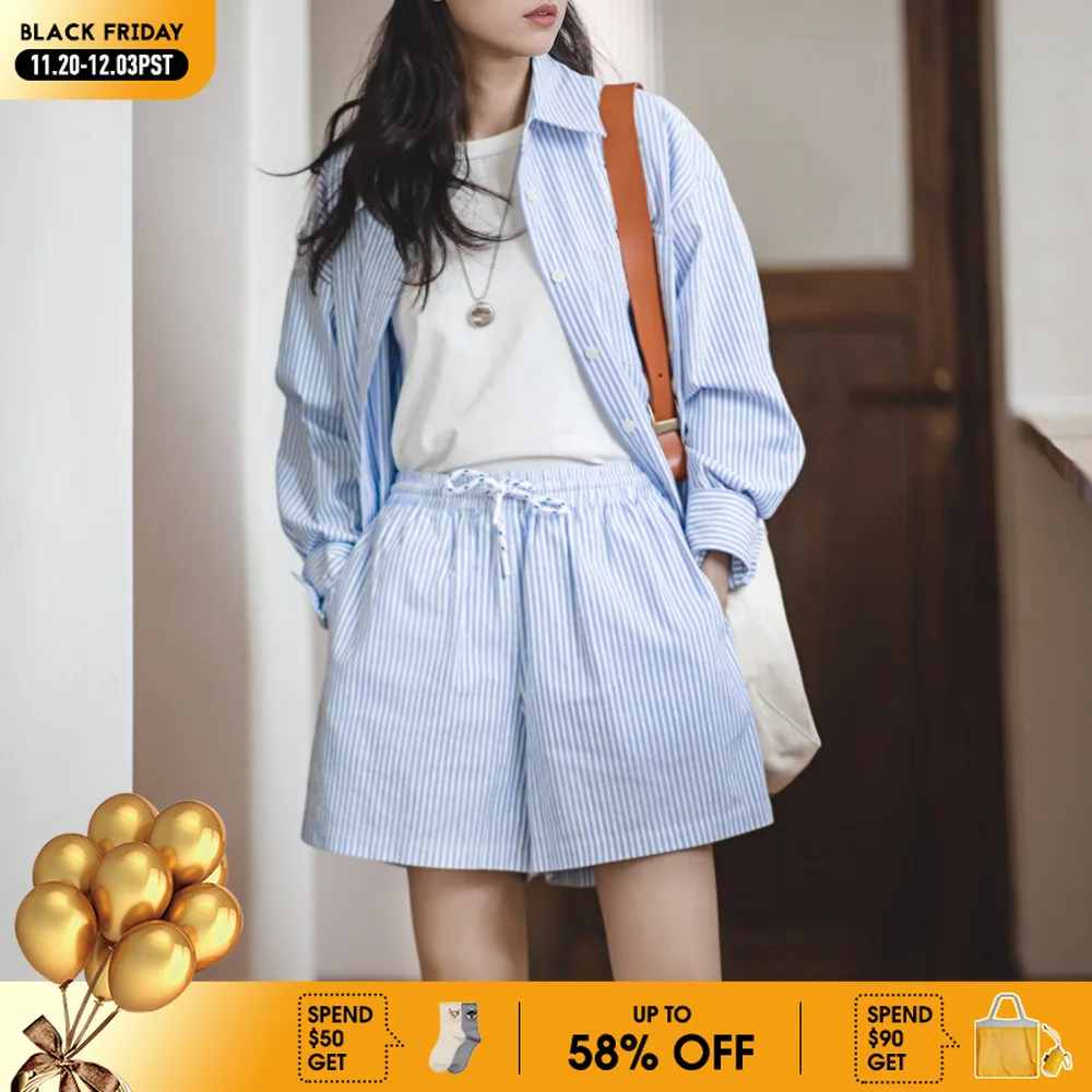 Maden-일본산 캐주얼 파란색과 흰색 줄무늬 반바지 여성용, 면, 느슨한 스포츠 넓은 다리 짧은 바지, 높은 허리 버뮤다 반바지