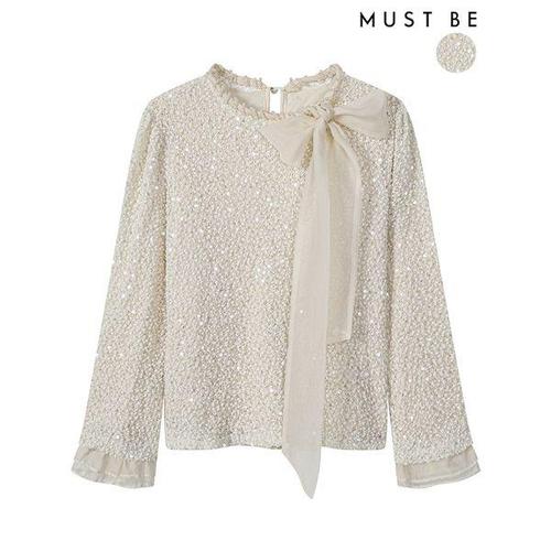 [머스트비]여성 리본타이 진주 스팽글 블라우스