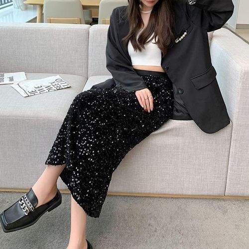 [에이치플러스몰]여성 2컬러 허리밴딩 스팽글 롱스커트 미디스커트