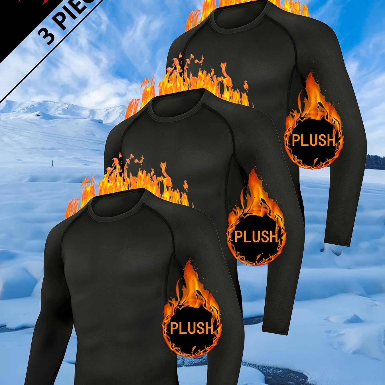 TEMU 3개 남성용 기모 속옷 - 불꽃 디자인 긴팔 운동 셔츠, 두꺼운 타이트핏 운동 상의 (헬스, 러닝, 스키, 사이클링용) - 통기성 폴리에스터, 겨울 스포츠 베이스 레이어, 헬스복, 세련된 디자인, 중간 탄성|헬스복